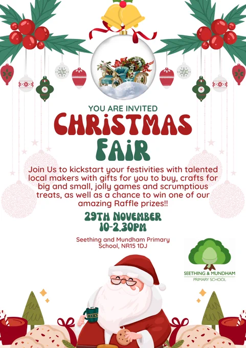 @SeethingPrimary - 1st December 2025I would like to say a HUGE thank you to the amazing Friends of Seething & Mundham Primary School and staff for all their hard work on this year's wonderful Christmas Fair. Also, thank you and everyone who came and supported it, you have helped raise a fantastic amount of money!